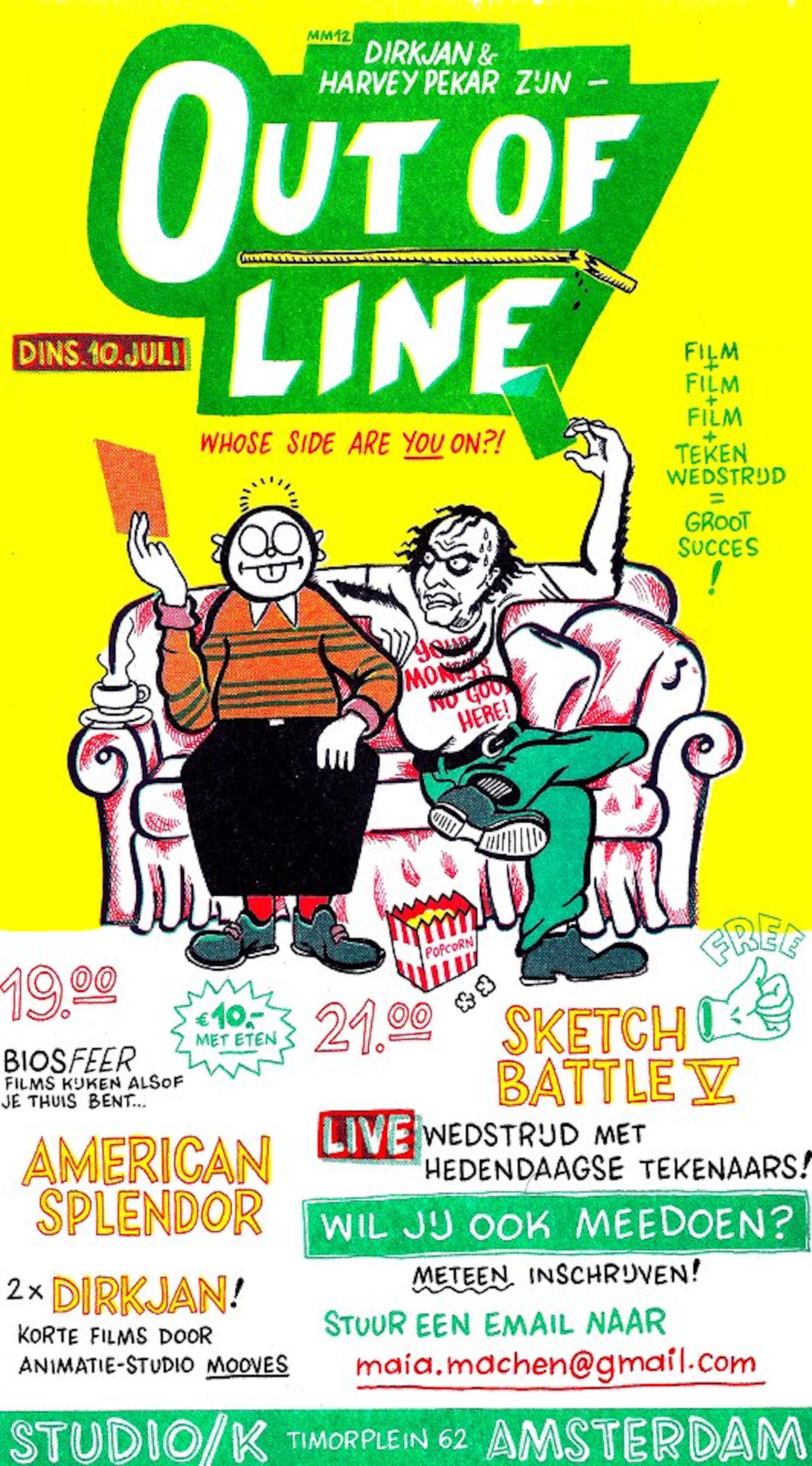 SKETCHBATTLE: Naast een aantal schitterende animatiefilms is er tijdens deze BIOSFEER een live sketchbattle waaraan ook jij kunt deelnemen. Op twee overheadprojectors nemen tekenaars het tegen elkaarop aan de hand van een thema. Opgeven kan via maiamachen@hotmail.com of op de avond zelf.