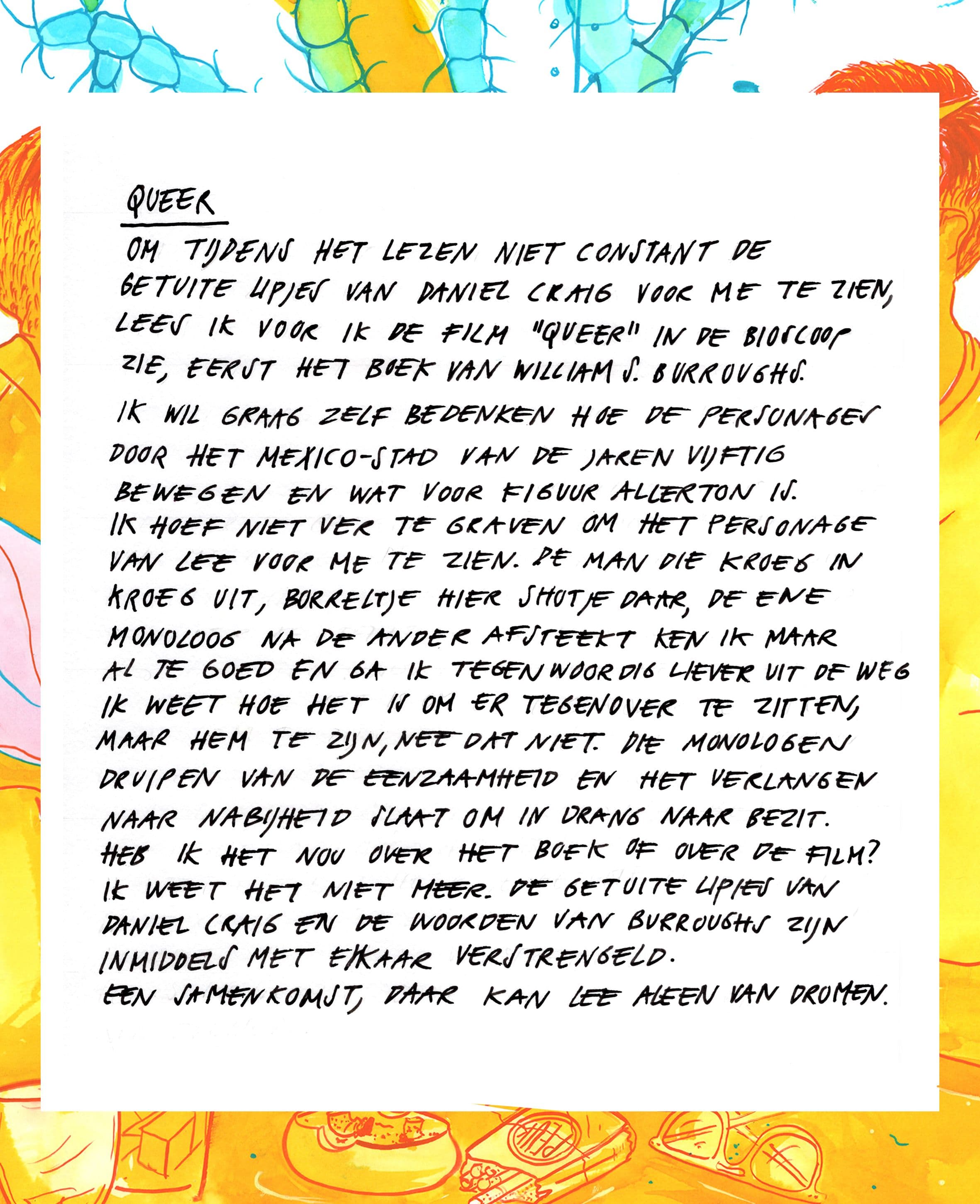Beeldcolumnist Mathilde Bindervoet last eerst Queer het boek, en ging toen naar Queer de film. ‘De getuite lipjes van Daniel Craig en de woorden van Burroughs zijn met elkaar verstrengeld. Een samenkomst. Daar kan Lee alleen van dromen.’
